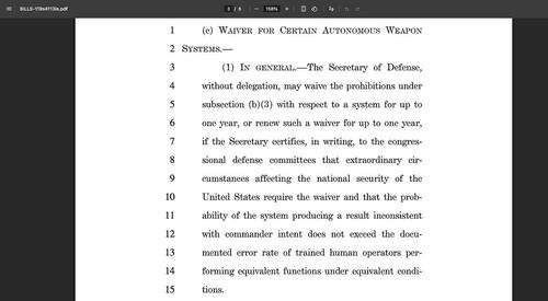 The legislation places a restriction on autonomous lethal AI systems while granting the Secretary of Defense—currently Pete Hegseth—the authority to waive that restriction under “national security” conditions.